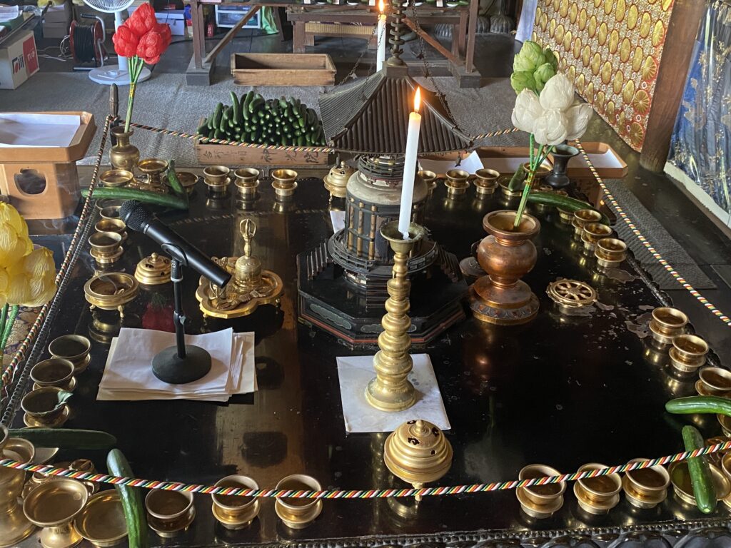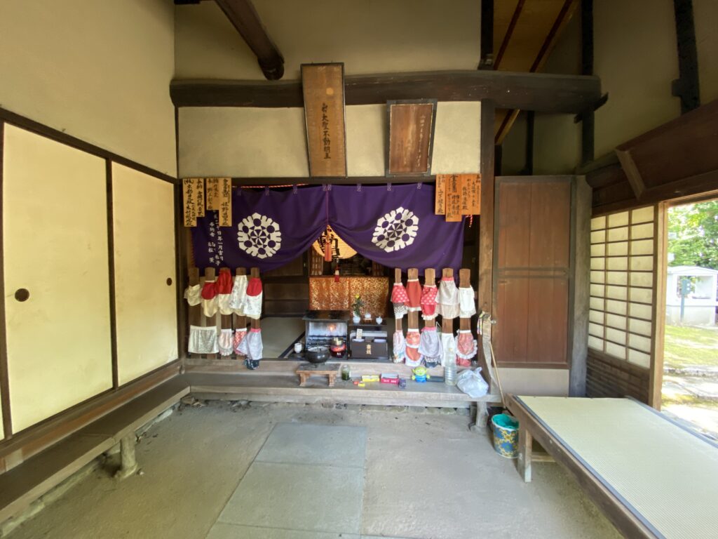 On the main temple altar there are many deities. One of the main objects of worship is a statue of Kobo Daishi, who represents warding off all evil. The temple’s Kobo Daishi statue is carved in wood. Kobo Daishi returned from his pilgrimage to China as the eighth Patriarch of Esoteric Buddhism, and while abroad he had learned Sanskrit and its Siddhaṃ script, studied Indian Buddhism, as well as studied the arts of Chinese calligraphy and poetry, all with recognized masters. He also arrived with a large number of texts, many of which were new to Japan and were esoteric in character. Kukai helped to distinguish the new form of Buddhism from that already practiced in Japan.
