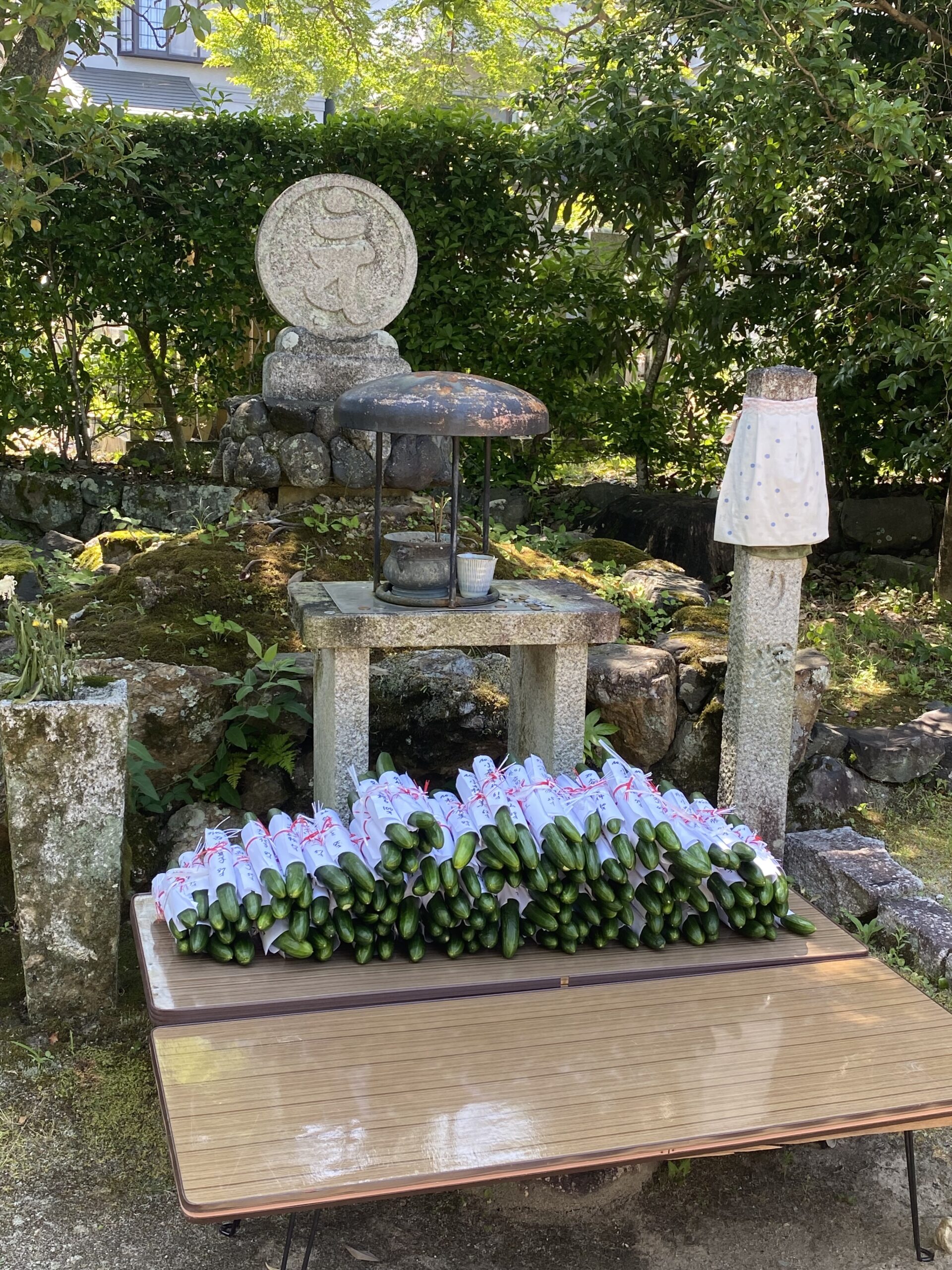 Jinko-in is famous for the kyuri kaji or “cucumber exorcism” held every July 21st to ward off various sicknesses. Many people register for the service because they believe that it will provide relief from illness and promote comfort in healing. The way that the ritual is conducted is by attaching a piece of paper with the names of individuals, their age, and their illness and tying with a string to a cucumber. A ritual is then held in which the participant’s illnesses are transferred into the cucumber and then sutras are chanted to promote healing. The temple buries the cucumber as a sacrifice and people’s illnesses are believed to be healed when the cucumber decomposes into the soil. This healing method was supposedly introduced from China by Kukai.