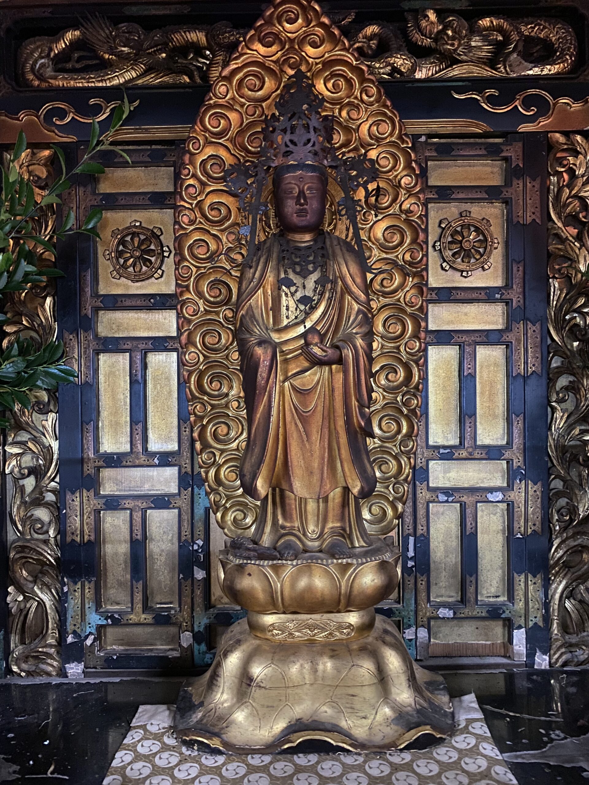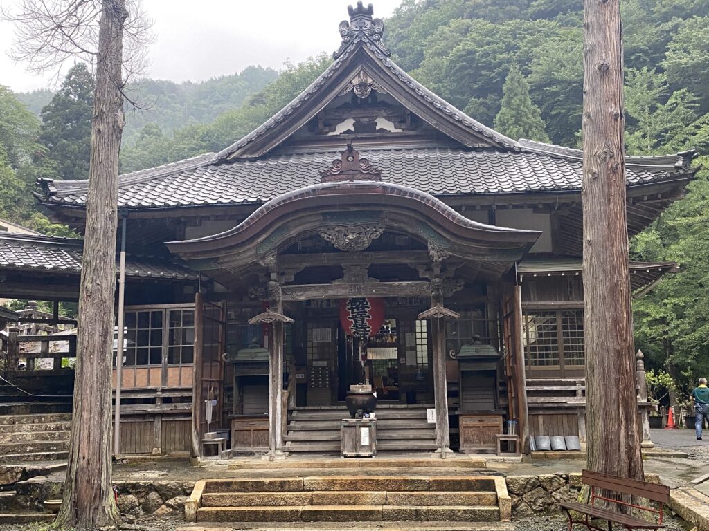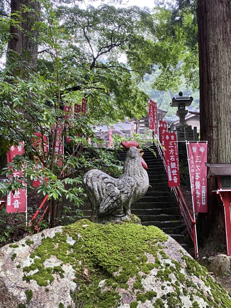 Mikataishi is not technically a temple, but a pilgrimage site that is run by a lay association instead of monastics. 1200 years ago, Kobo Daishi, a noted priest and founder of Shingon Buddhism, decided to reside here during his pilgrimage across Japan. He set out to carve a statue of Kannon, the Goddess of Mercy also known as Avalokiteśvara, on a slab of granite. Immersed in his venture, Kobo Daishi lost track of time throughout the night until he was alerted of the approaching morning by a rooster. He was forced to leave Mikataishi without finishing his carving, leaving Kannon’s statue with a missing hand. Because of the missing hand, it is said to have healing powers for those who have disabilities in relation to limbs. This “one handed Kannon” was carved out of a boulder, which the main hall was built around. It is a hibitsu (hidden Buddha), covered by doors, waiting to be revealed every 33 years. A stand-in Kannon statue can be seen in the main altar in front of the doors.