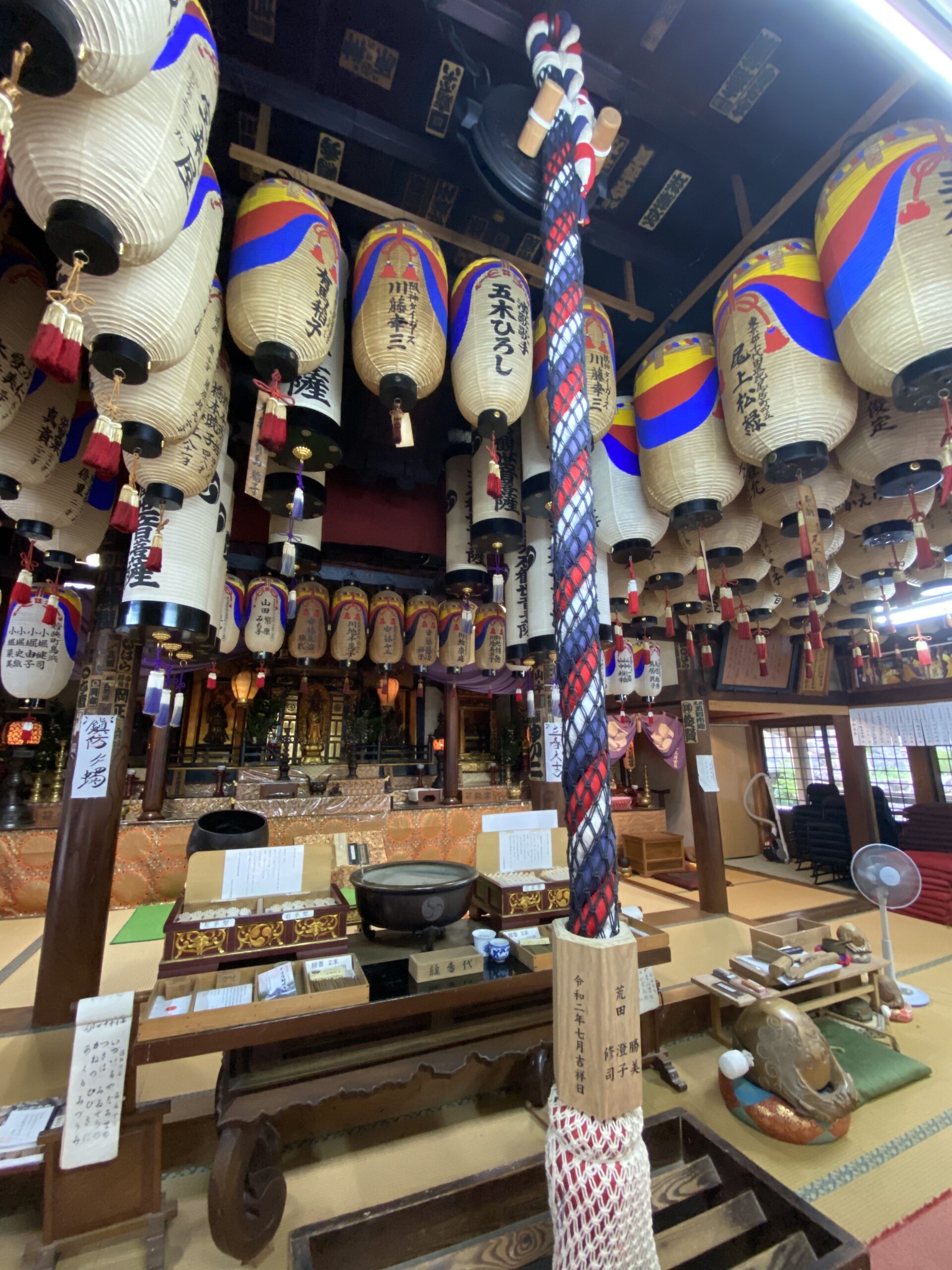 In addition to the statues of Kobo Daishi and Kannon, the main hall has sutras available for viewing that are often used for chanting in rituals. Close by, a woodenfish can be seen. Instruments such as bells, gongs, and drums are used for rhythm and emphasis in rituals and chants. When looking at the ceiling, there are also noticeable stamps from those who have ventured through Mikataishi during their pilgrimages.