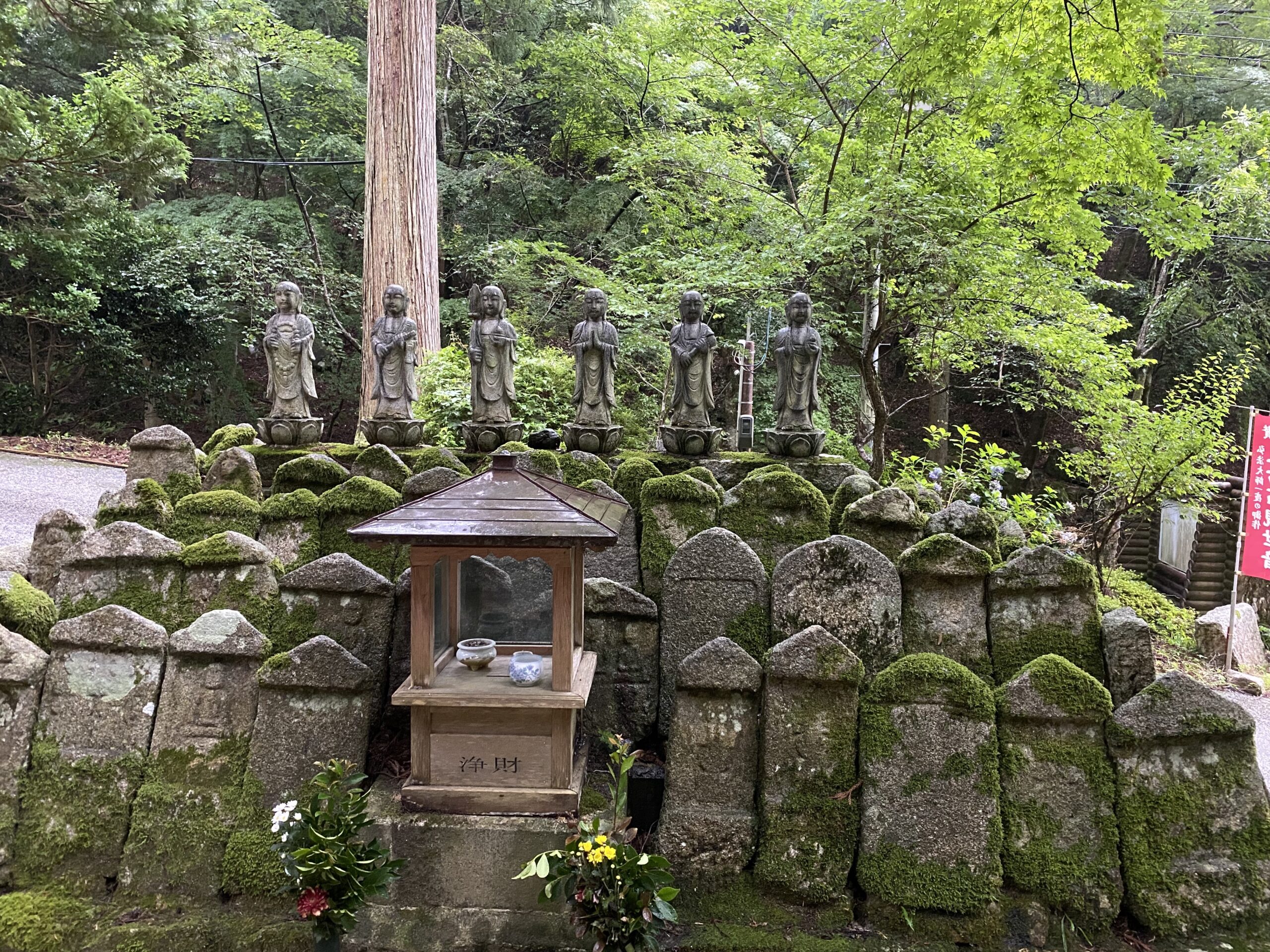 When entering the main hall, there are statues of Kobo Daishi and Kannon. Kobo Daishi, also known as Kukai, was a Japanese Buddhist monk who founded the Shingon sect. He initially followed the cultivation of Buddhism at the age of 14 and learned esoteric techniques when he visited China after he was ordained as a priest. He later brought his teachings to Kyoto and is said to have stopped here at Mikataishi during his travels through Japan. Kannon is a major Mahāyāna bodhisattva in Buddhist sacred texts. Mostly associated with compassion, Kannon is often depicted with many heads and multiple arms, but here at Mikataishi, Kannon is missing an arm to suggest healing powers.
