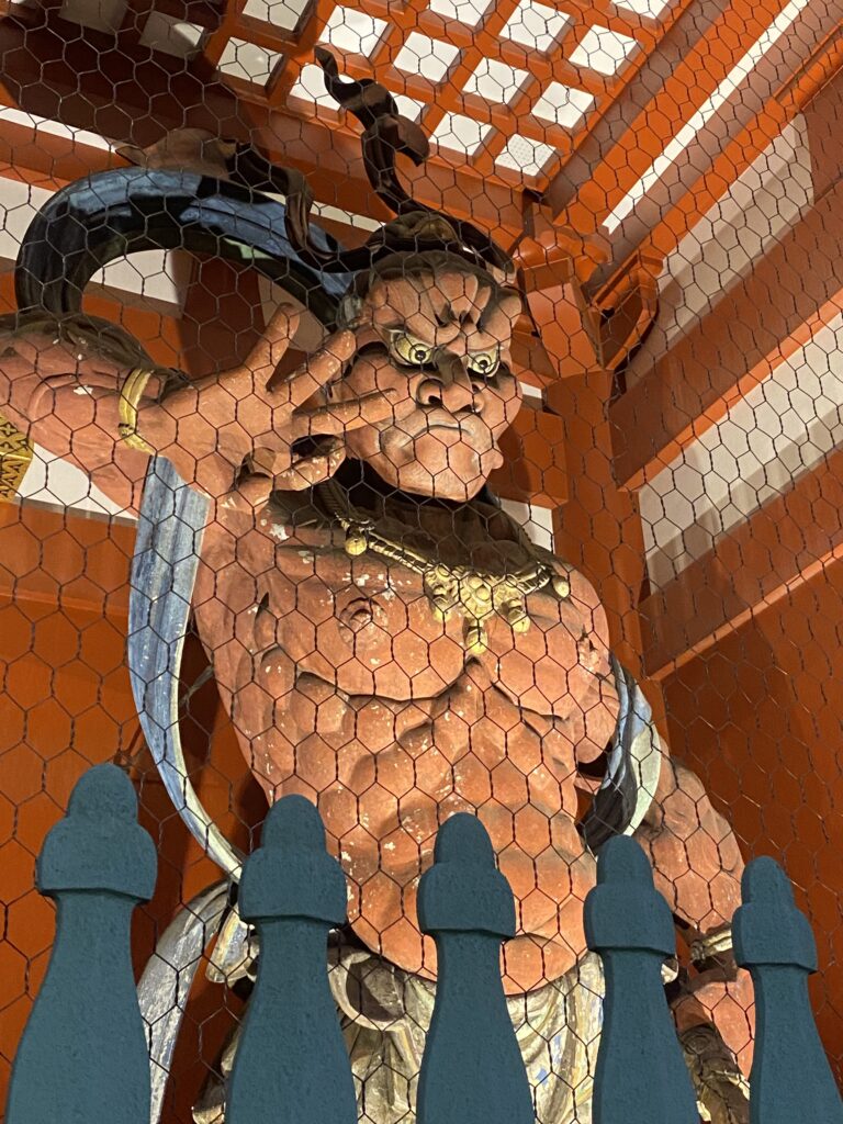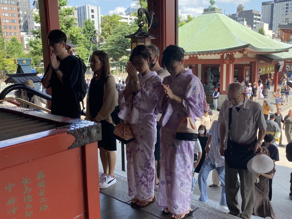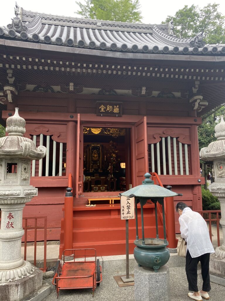 The main hall contains the statue of the Sacred Avalokiteśvara Bodhisattva, the goddess of mercy known as Kannon, to whom the temple is dedicated. In order to pray at the main hall, visitors are told to place their hands in the prayer position and say “Namu Kanzeon Bosatsu,” which means “I place my trust in Kannon Bodhisattva.” Kannon represents the compassion of all the Buddhas, and is described as having eleven heads and a thousand arms so that they can hear all cries and aid those who are suffering.