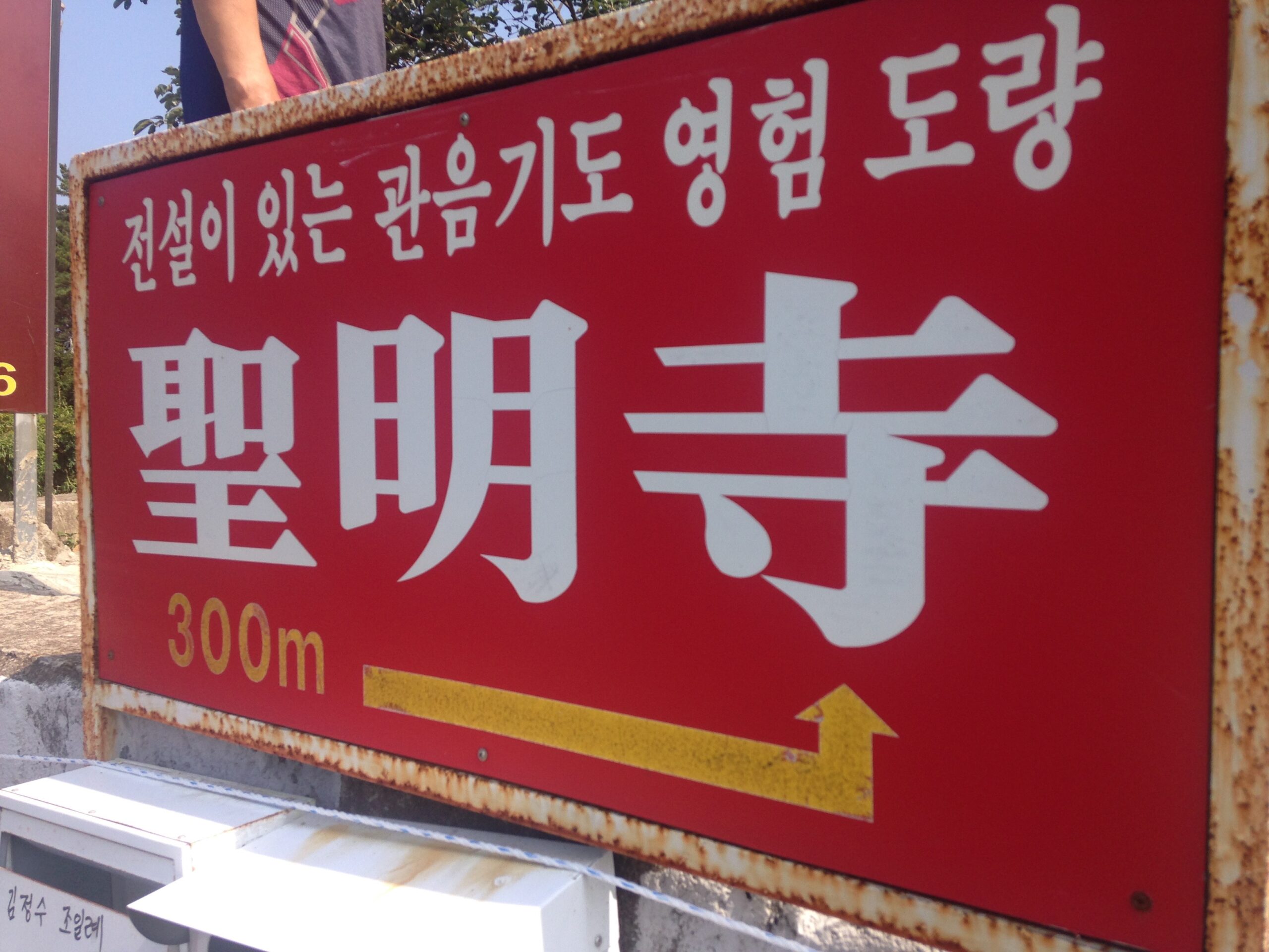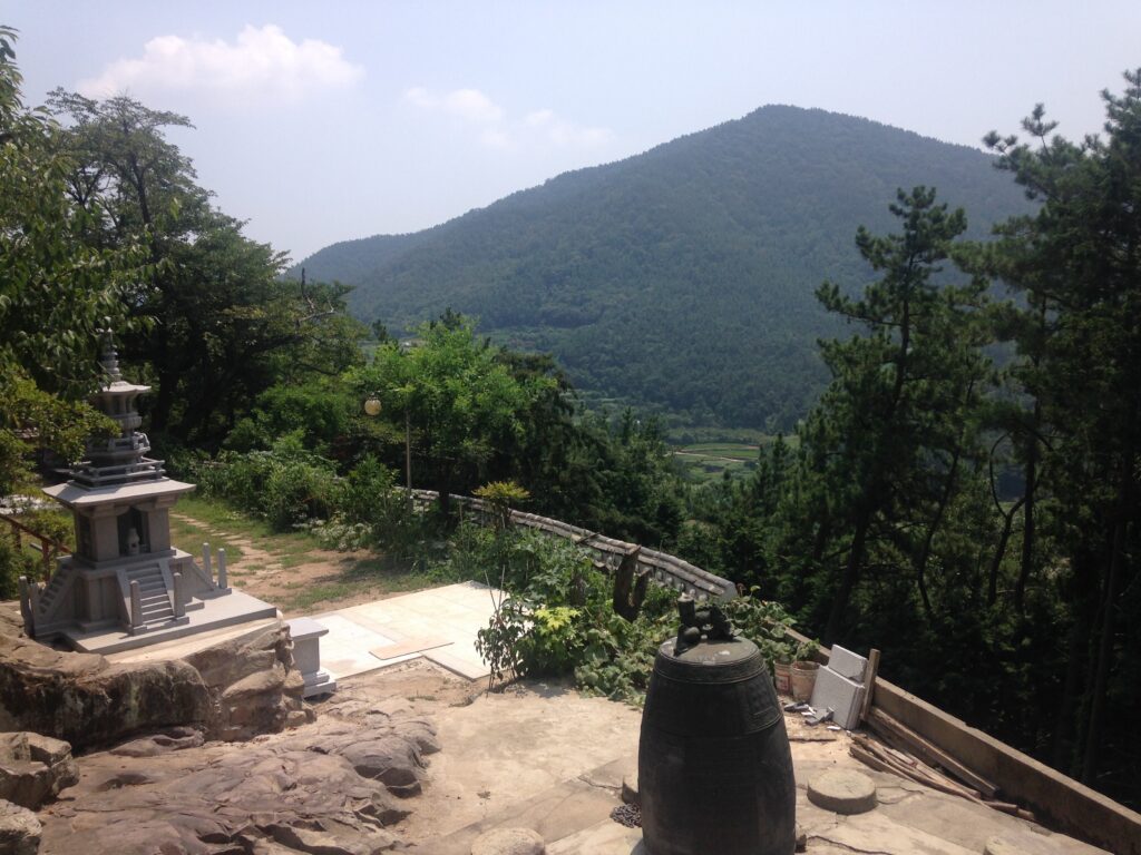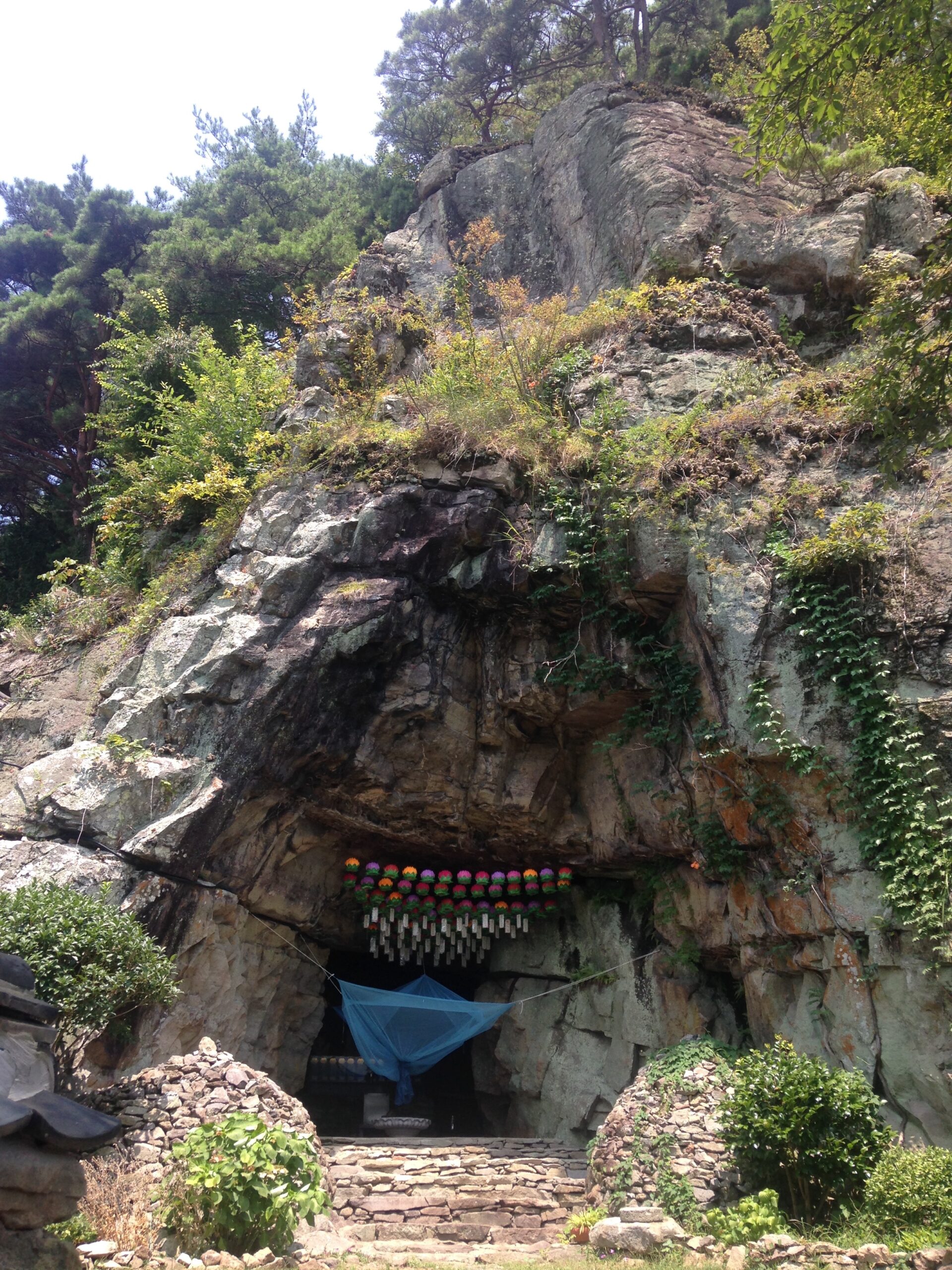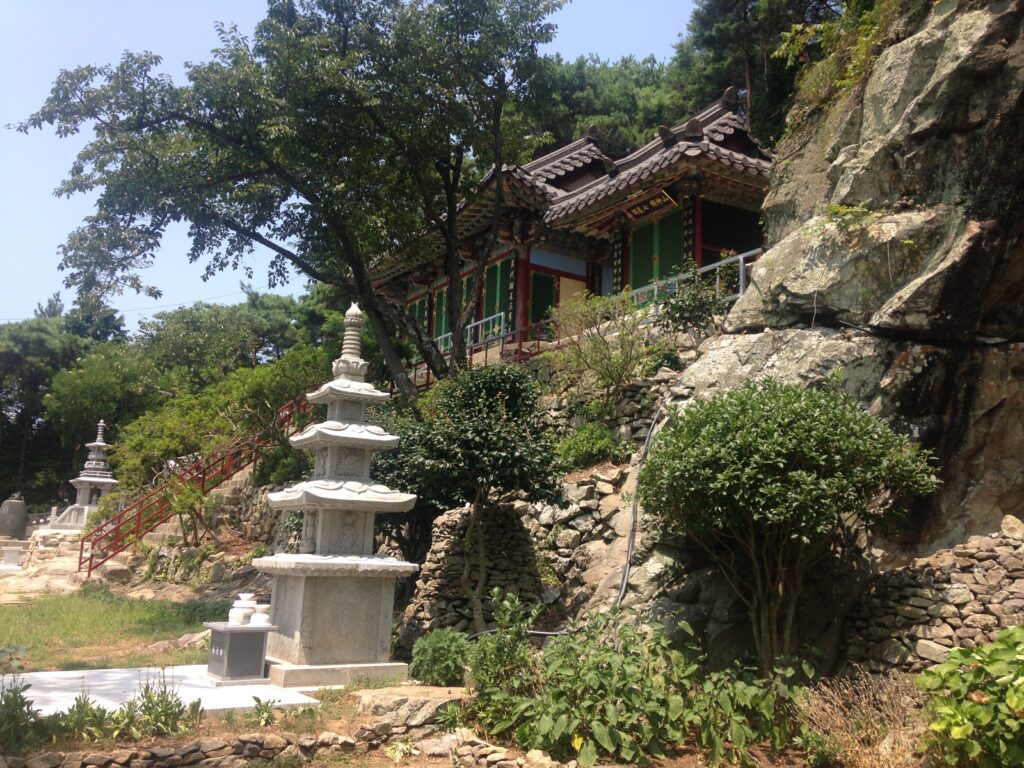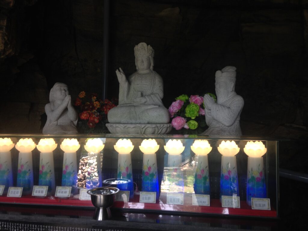 Located in Namhae, South Korea, Seongmyeong Sa 성명사/聖明寺 is situated on a forested hill overlooking a small fishing village. The surrounding area is mainly agricultural and relatively undeveloped. The closest city is about 1.5 hours away and a tourist beach resort is about 30 minutes away. The temple is nonetheless a pilgrimage site for visitors from around the country. There are also lay attendants that frequent the temple to cook, clean, and take care of it. There are shrine buildings that are similar to other Korean temples, as well as a unique cave-shrine for the bodhisattva Gwanseeum (Ch. Guanyin; Skt. Avalokiteśvara). In this cave, there is a natural spring which impresses ever-changing images on the cave. The natural spring water is collected into a bowl, and considered to be “medicinal” or “empowered water” (yagsu 약수/藥水), believed to cure diseases and purify the devout.