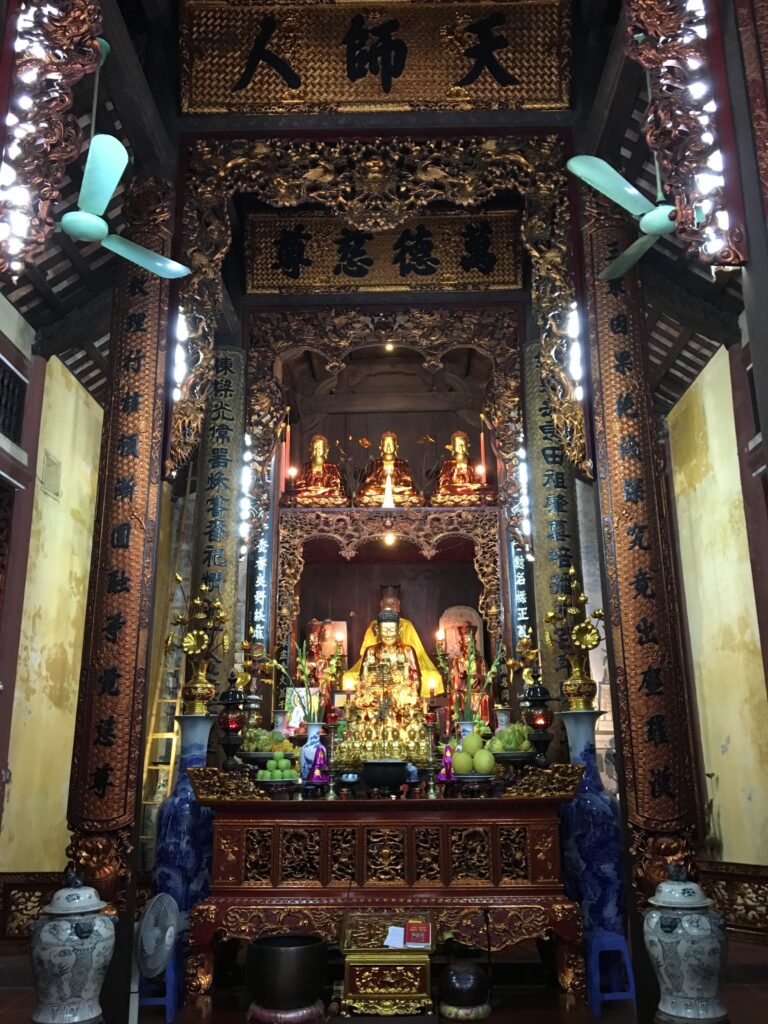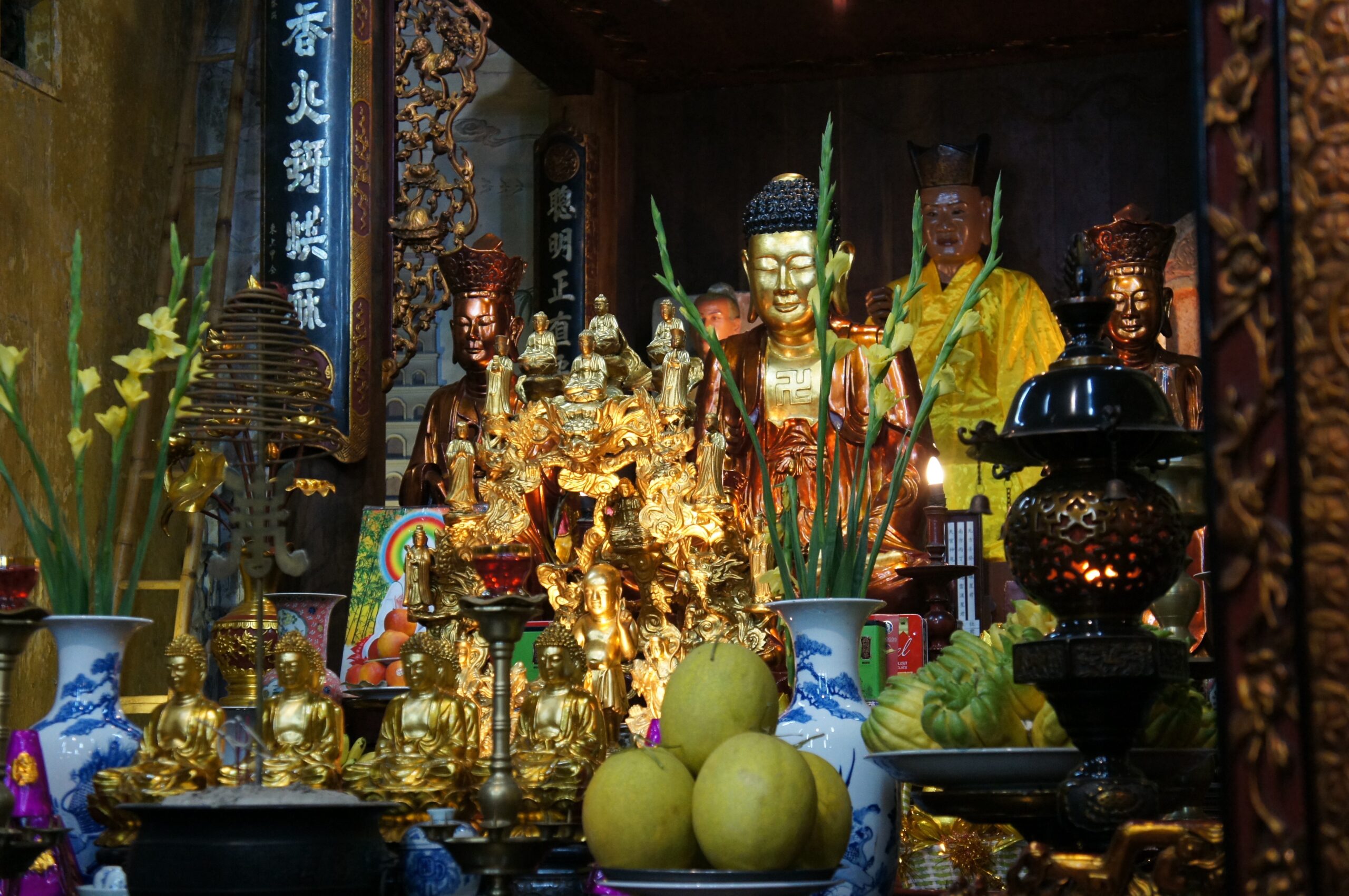 In 1138, Nguyễn Chí Thành cured King Lý Thánh Tông of a disease deemed incurable by other doctors. The king later gave him the title Lý Quốc Sư 李國師, “Great Teacher of the Lý Nation,” and built him a residential quarter next to the Báo Thiên Pagoda. There, Lý Quốc Sư preached Buddhist sutras, and taught medicine and even bronze casting (he is often referred to as a “patron saint” of the bronze casting craft) (Vietnam Online). After Lý Quốc Sư’s death in 1141, the king Lý Anh Tông converted his residential quarter into a pagoda to honor both him and the Buddha. Today, many pagodas throughout Vietnam feature both Buddha and Lý Quốc Sư (Tran 2020).