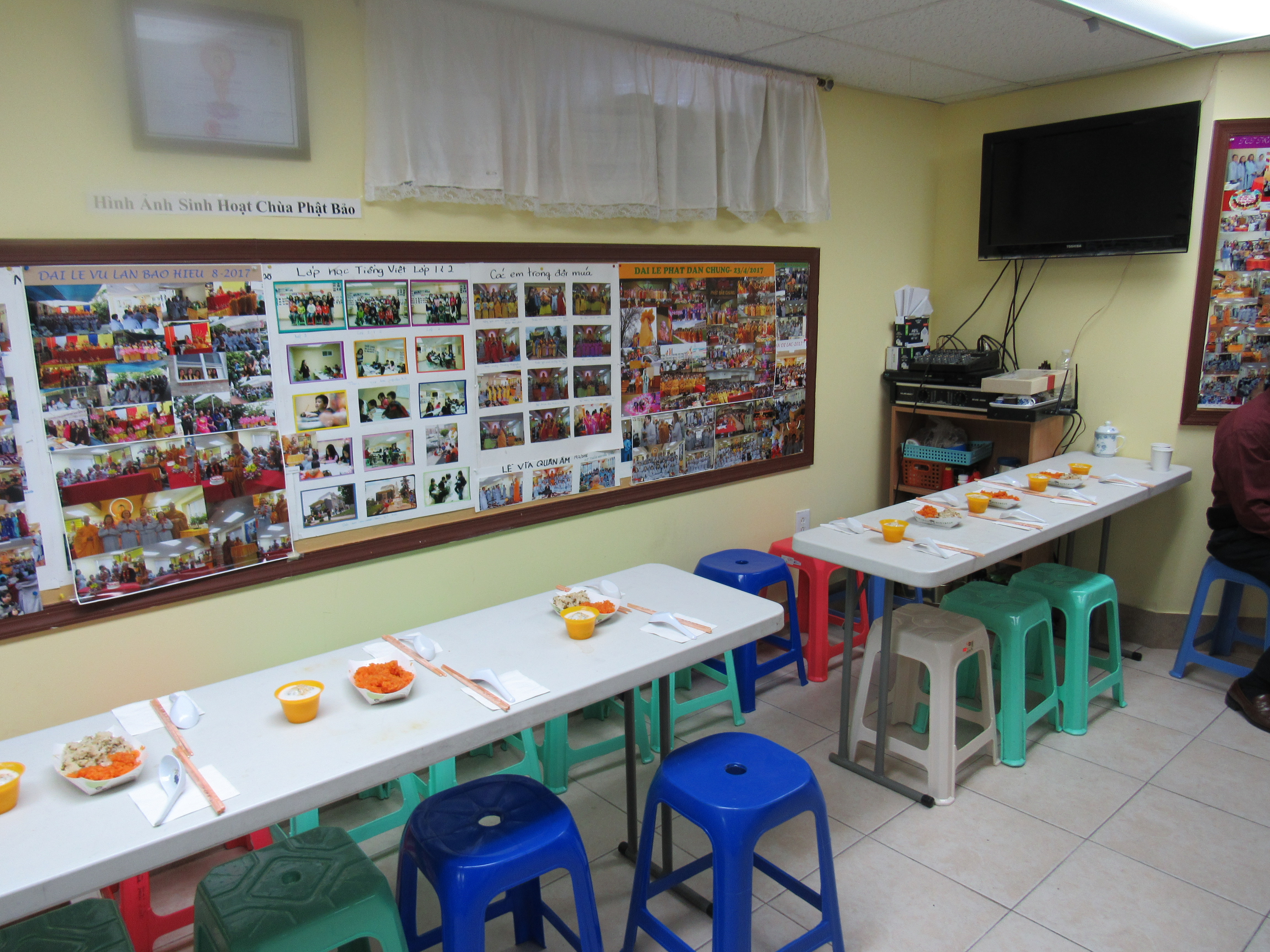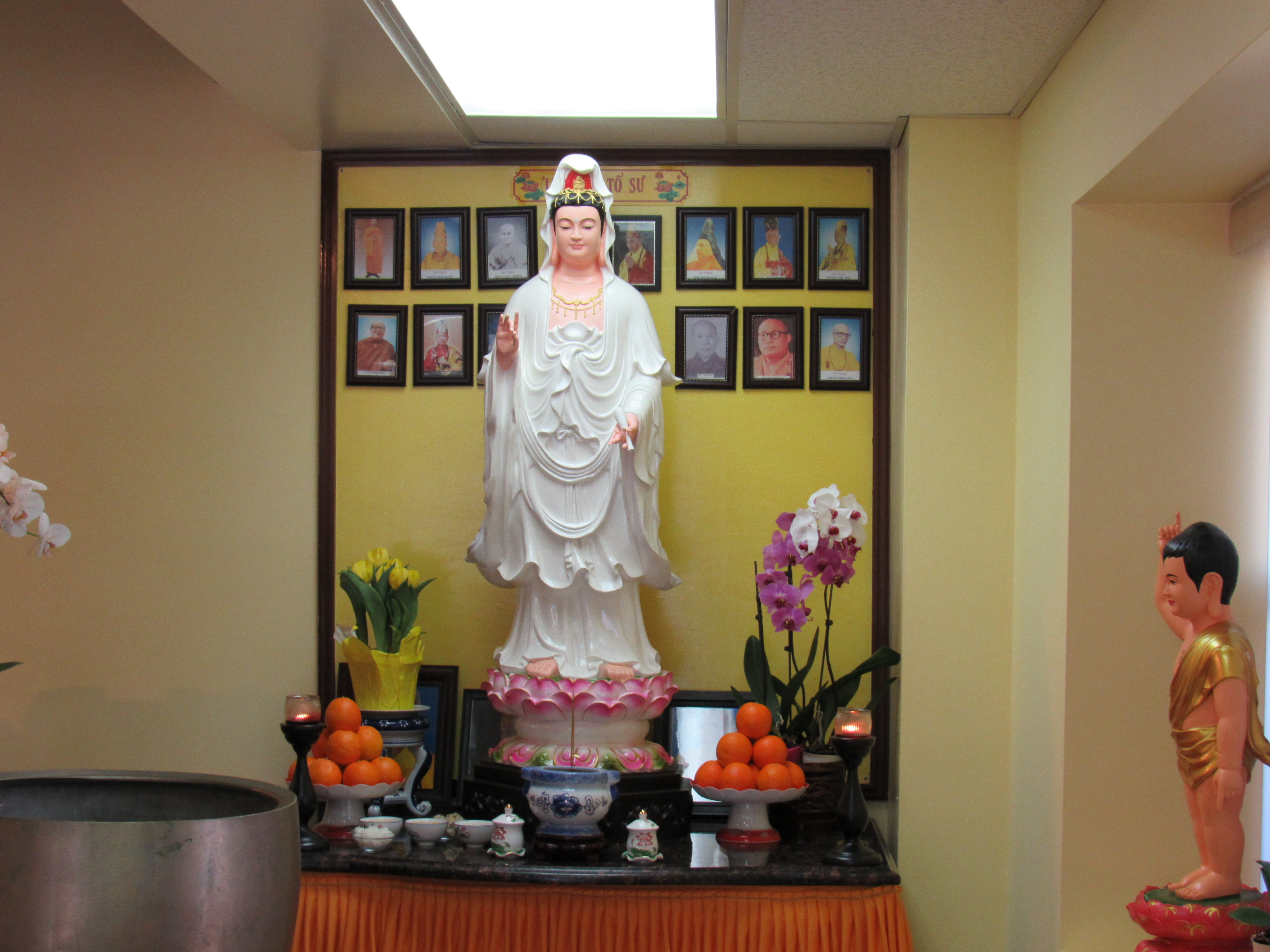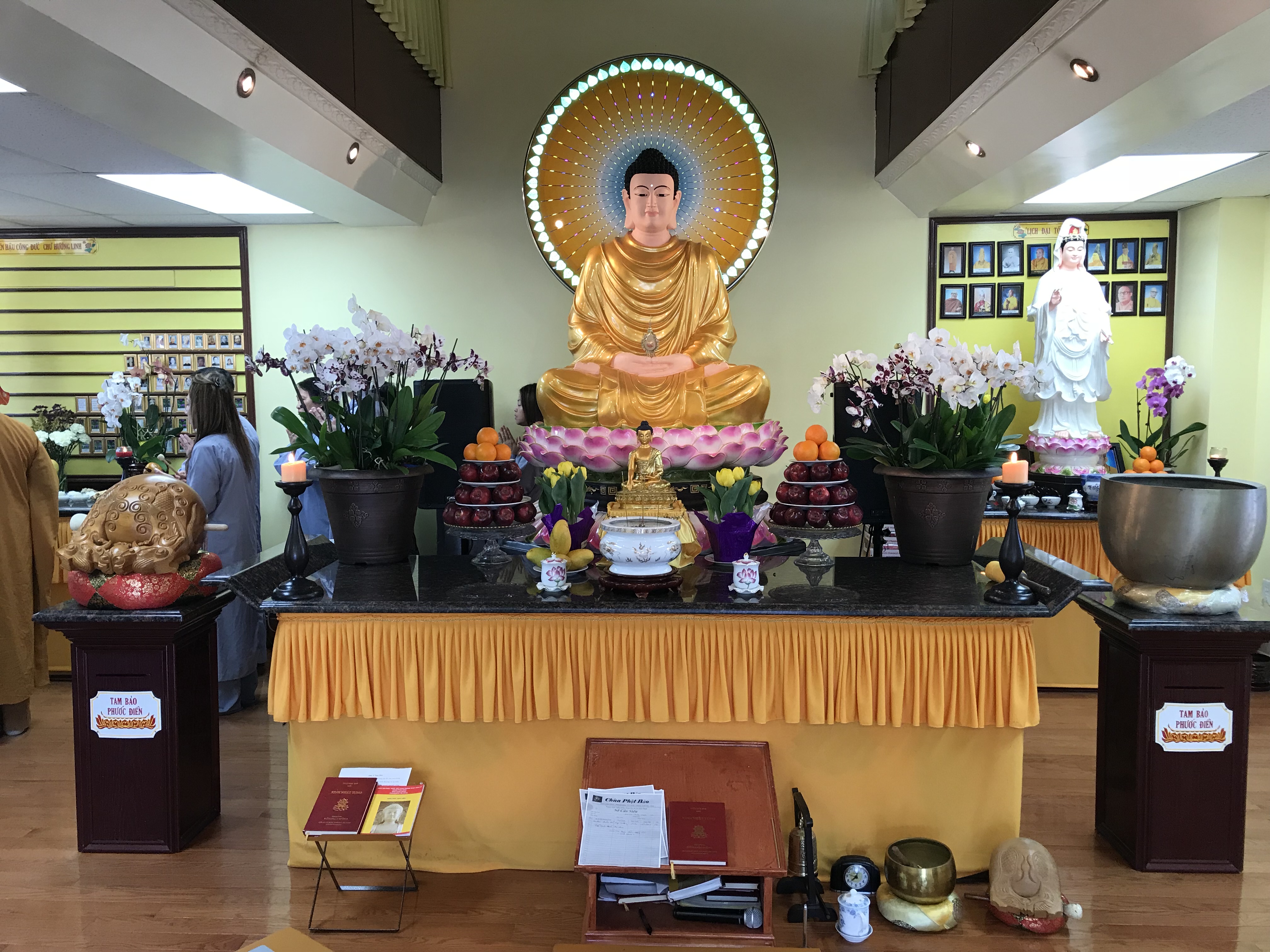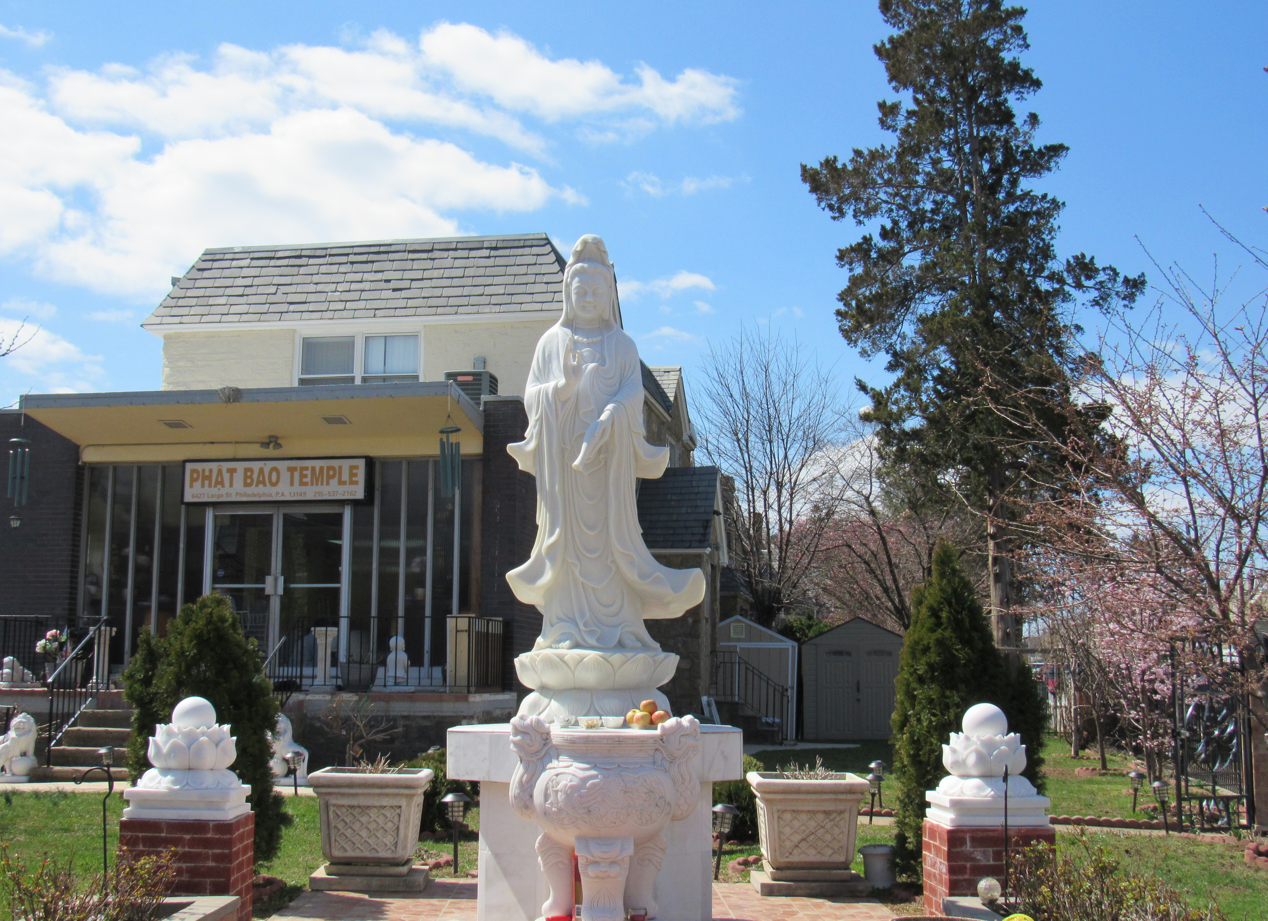 Meditation practice daily at 7pm, main service Sun. 10:30am. Established 2009 in a repurposed Catholic church. Like many Vietnamese temples in the region, this temple has a prevalent statue of Avalokiteśvara (Quan Âm) in front of the entrance. Interior altars focus on the Buddha, Avalokiteśvara, Kṣitigarbha. There are two monks that are in residence here, and there are nuns that come here to visit from other temples but do not live there. One of the monks is a disciple of a prominent monk in Thailand. This family-focused temple caters to attendees of all ages, and holds Vietnamese language classes and Dharma talks for kids in the basement during services. We are told about 90% of participants are of Vietnamese descent, and about 10% Chinese. About 70% are over 60, the majority are female, and about 20% of the participants on any given day are visiting from other temples in the area. According to census data, there has been a significant Vietnamese population in the surrounding neighborhoods since at least 1980. While initially distancing themselves from engaging in medical practices per se, the abbot does hold that meditation say helps practitioners achieve inner peace by connecting the mind and body, leading to healthy thoughts and a healthy mind. Chanting and ritual practice dedicated to Bhaiṣajyaguru, Quan Âm (Avalokiteśvara), and other deities is practiced by the sick, but the abbot stresses this is intended primarily as a means of cultivating mental comfort and peace. Some interviewees mentioned bowing to Quan Âm as a health practice, and the idea that the energy exerted for each bow will be returned to help repair the body. They also claim that the vegetarian food they serve has some health benefits, as they help to gain good karma and to prevent diseases and sickness. Some specific ingredients are claimed to help with digestion, help improve sleep, and so forth. As many of the people who attend this temple work in health fields, temple members organize an annual flu shot clinic in coordination with the Health Care Department of Philadelphia, and periodically operate a health clinic with blood pressure checks and other basic health exams for the community. The temple also collects toys for the Children's Hospital of Philadelphia, among other charitable works.Phat Bao Temple